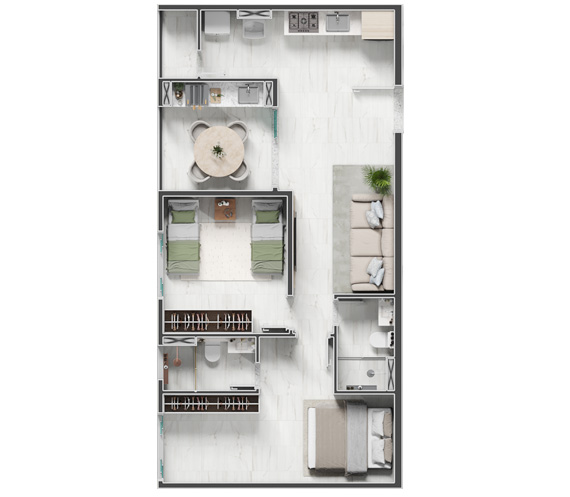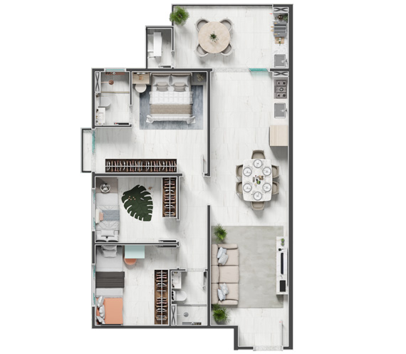 Com sacada na suite, oferece um espaço privado e agradável. Seu layout com conceito integrado une sala de estar, jantar e cozinha, criando um ambiente amplo e aconchegante.